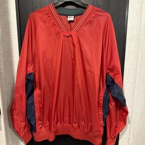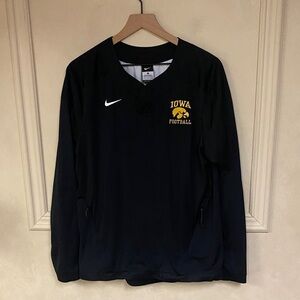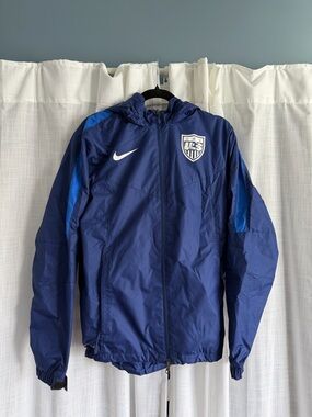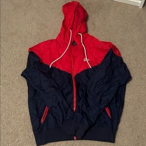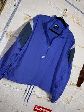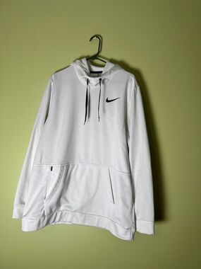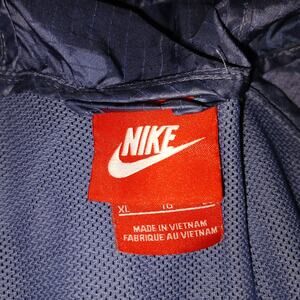 Nike colorblock joggers in white and navy. Elastic drawstring waist for an adjustable fit. Lightweight athletic fabric with stitched Nike Swoosh. Sporty two-tone design for casual wear.