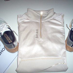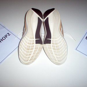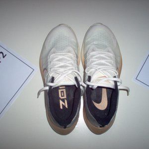 Sleek Nike running shoes. White body with peach details. Lightweight and supportive.