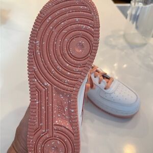 Nike sneakers featuring a white base with dusty pink accents. New and never worn. Also fits women’s size 7. Ideal for everyday style.