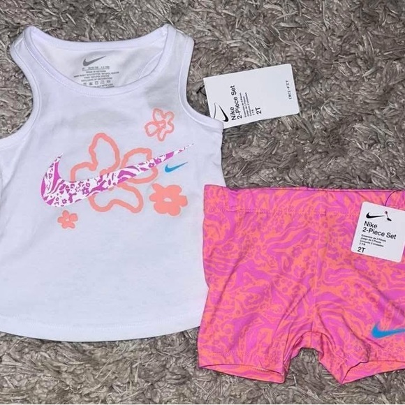 Charming Nike set with a white tank and pink floral design. Includes matching pink shorts. Ideal for playtime.