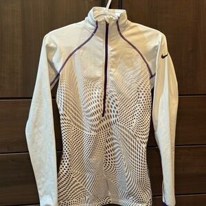 Nike long sleeve top in white with purple accents. Features a dynamic pattern and zip-up front.