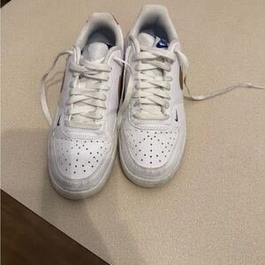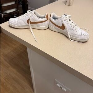 Nike sneakers with a white base and tan swoosh. Blue logo detail adds contrast. Comfortable and stylish.