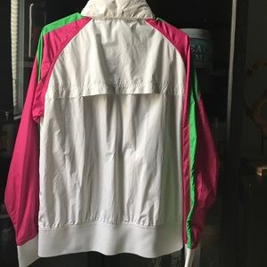 Vintage style Nike windbreaker. Pink, green & white. It is a women's large and does have a few light stains. If you have any questions feel free to let me know. Thanks.