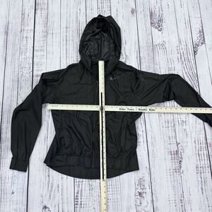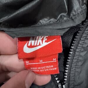 Nike Windrunner Track Town jacket in women’s size Medium. Black lightweight polyester shell with classic chevron front, “TRACK TOWN” graphic across the back, and Olympic rings flag patch. Full-zip front, adjustable hood, elastic cuffs, and zip hand pockets.
