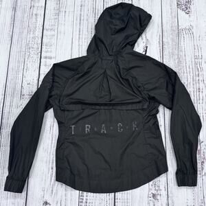Nike Windrunner (Women’s M) in black with the classic chevron, “Track Town” back print, and Olympic rings flag patch. Lightweight polyester, full zip, hood with drawcord, zip pockets, elastic cuffs.