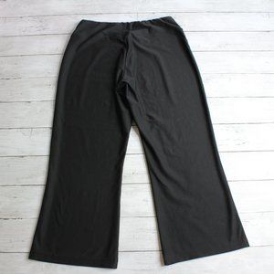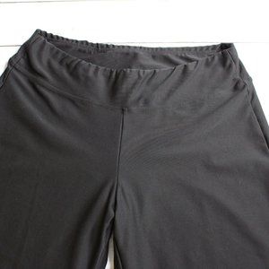 These solid black athletic pants have stretch with a wide waistband with thin elastic. They have more of a relaxed fit with wider leg. I believe they are slightly vintage however I am not positive. They are excellent hardly used condition.