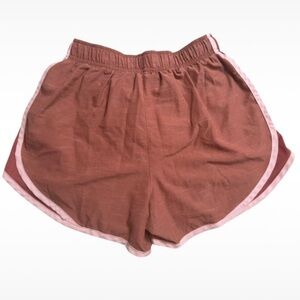Nike athletic shorts with a rust body and pink trim. Ideal for active wear.