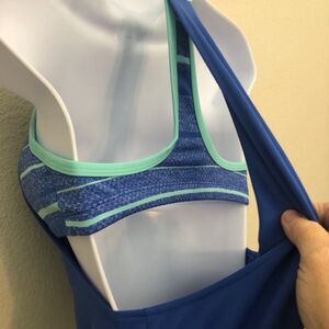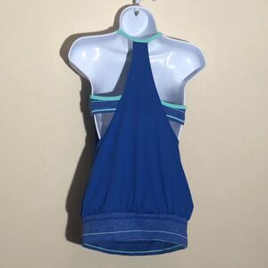Keywords: Nike tank top, athletic tank, workout top, built-in bra, blue activewear, women's fitness apparel, exercise tank, gym top, sleeveless top, sports tank, yoga top, running top, active tank top