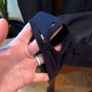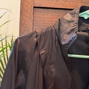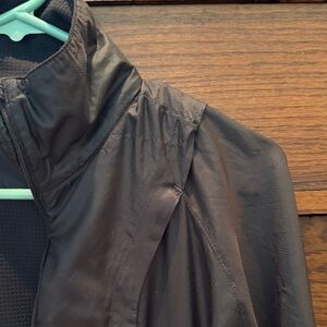 Sleek black jacket Nike. Lightweight and versatile. Small hole near thumb hole on right sleeve.