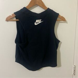 Chic and versatile Nike muscle tee. Features bold white logo on black fabric. Ideal for workouts or casual wear. Logo on the back, crop top, athletic wear