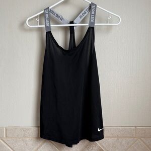 Sleek black tank top with gray 'Just Do It' straps. Ideal for workouts or casual outings. Features iconic Nike logo.