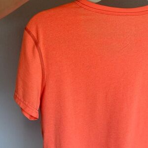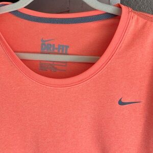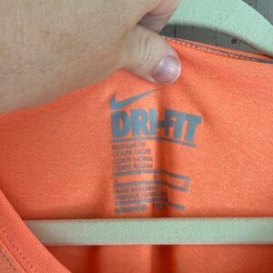 Vibrant orange Nike tee with Dri-FIT technology. Ideal for active or casual wear. Small spot on back of shirt as showing in last picture that I did not notice until taking pictures. Have not tried to get out. Price to reflect.
