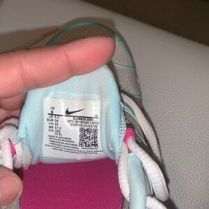Stylish Nike sneakers with cream and blue design. Features pink and yellow accents. Ideal for casual wear.