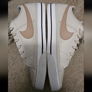 Stylish Nike sneakers. Cream upper with tan accents. Comfortable and versatile. Worn twice. Womens 7.5