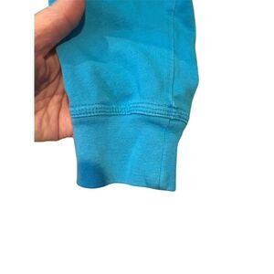 This Nike pullover sweatshirt for women features a colorblock pattern in blue and white. It is a cropped style with a bold logo, designed for casual occasions in the spring. The sweatshirt is made from soft fabric, has a crew neck, and long sleeves. It is machine washable and available in a regular size medium. Ideal for casual outings or relaxed gatherings. The item is pre-owned, and the material and care tag are missing.