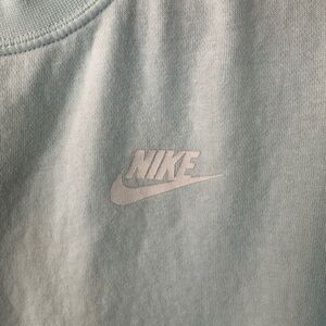 Sporty meets chic in this cropped Nike crewneck sweatshirt! Featuring a soft baby blue color, hi-lo hem, and signature Swoosh logo, this top adds the perfect athletic edge to your everyday look. Great for layering post-workout or styling with high-waisted jeans or leggings.