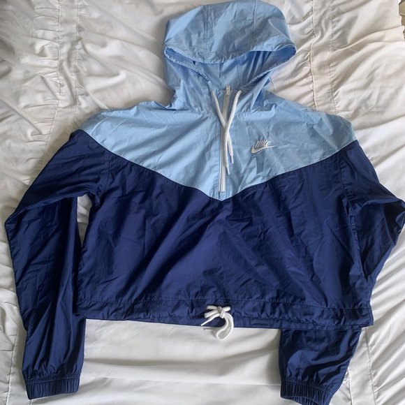 Gently used cropped windbreaker. Hood and bottom hem with drawstring and elastic cuffs perfect for avoiding wind. Great for athletics especially running or a casual look. Size in Women's XS. Only defect is a tiny black spot approximately 1 millimeter in diameter pictured above next to nail.