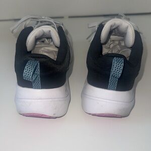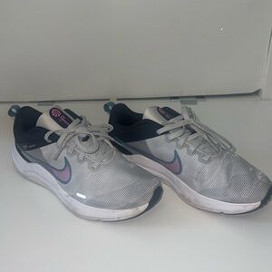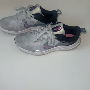 This is a preowned Nike Downshifter 12 running shoe for women in white with a pink spell color accent. It is a size 7 with a standard shoe width. The shoe belongs to the Nike Downshifter product line and features a sneaker style.