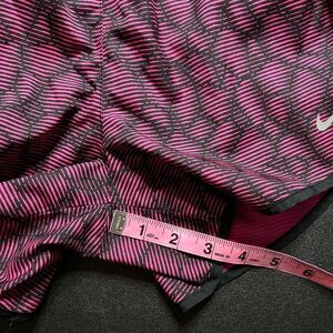 Pink and black Dri Fit Running Shorts from Nike. Elastic waist with drawstring. Built in brief liner. Size S. See photos for measurements. Good preowned condition with no tears or stains.