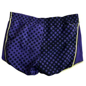 Nike women’s dri fit running shorts in a black and purple polka dot pattern with yellow/green trim. Size small.