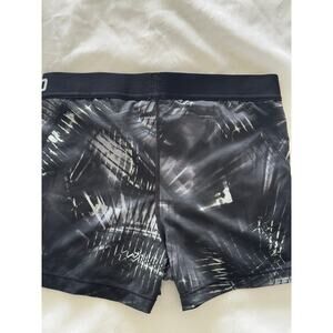 Nike Women’s Dri-FIT compression shorts in size Large, featuring a black and gray abstract graphic print. Smooth stretch fabric, supportive fit, and printed interior tag. Excellent condition with no stains or holes.