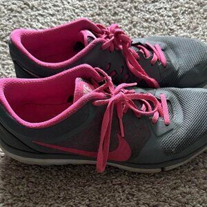 Worn several times. The Nike Women's Flex Running Shoes 2015 in Gray and Pink, size 10, are designed for running and jogging with a low top shaft style and Nike Flex product line. These sneakers feature the iconic Nike logo as accents, making them perfect for activewear and casual occasions. Released in 2015, these athletic shoes offer both style and performance, ideal for women who enjoy sports and staying active.