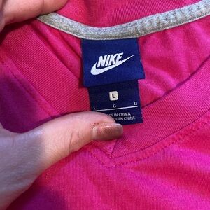 Bold fuchsia Nike tee with classic V-neck design. Iconic logo on tag.