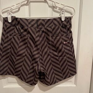Stylish Nike women's shorts. Features a black and gray chevron pattern. Comfortable and versatile design. Great for golf!
