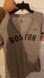 Stylish gray tee with Boston lettering. Features short sleeves with red and blue stripes. Comfortable and casual. EUC!