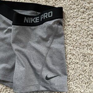 Nike Women's Gray Pro Shorts. Perfect for workouts or casual wear, these shorts offer a sleek design and a comfortable fit.
