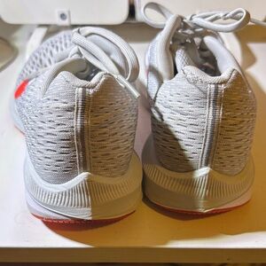 Stylish Nike running shoes. Features gray mesh with red accents. Comfortable and breathable design.