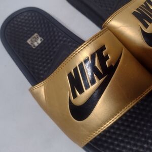 Nike Women's JDI Benassi Slides Sandals 10 Gold Black Swoosh Comfort A2