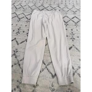 Comfortable and stylish Nike jogger pants featuring an elastic waistband and elastic cuffed ankles. Lightweight and smooth fabric makes these perfect for workouts, lounging, travel, or everyday athleisure wear. Clean, neutral color that pairs easily with anything. Not fully lined. Very lightweight.