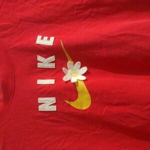 Nike Women's Large Pink With Yellow Swoosh White Daisy Short Sleeve Crop Top