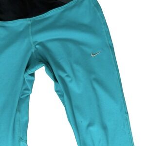 These Nike women's Dri-Fit leggings in size Medium offer performance comfort with a stylish teal body and black waistband. Perfect for running, yoga, gym workouts, or casual wear, they feature a convenient back zip pocket at the waist for small essentials. Made from a polyester-spandex blend, these leggings provide stretch, breathability, and moisture-wicking technology to keep you comfortable.