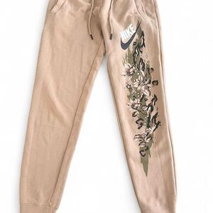 Cozy Beige sweatpants with embroidered floral design and classic Nike logo on the leg. Mid-rise, slim fit with elastic waist and pockets. Super soft fleece, perfect for casual wear or lounging. Smoke-free home.