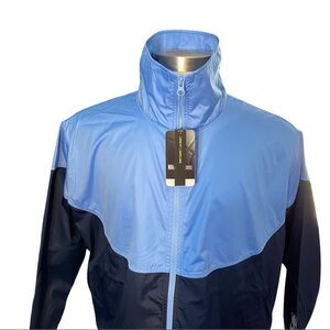 Nike Swoosh NBA Chicago Bulls “City Edition Courtside” with Bull’s Logo on Front Waist Hem Periwinkle & Navy Blue Color Block Rip Away Buttons on Both Sides for Venting & Ease of Fit 2 Slit Pockets on the Front Full Zippered 4 Red Stars on Back Collared or Mock Neck Loose Fit Track Jacket Windbreaker Women’s Size Medium. This jacket is new with tags. The chest measures 21” flat with a Length of 27”.