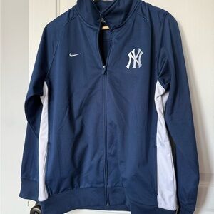 Classic Nike varsity jacket. Navy body with white sleeves. Iconic logo on chest.