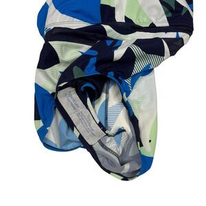 Navy blue, royal blue, white and. mint green abstract floral print bathing suit.