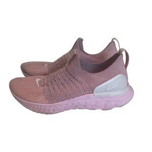 Nike running shoes, pink athletic shoes, women's Nike shoes, Flyknit sneakers, Nike React shoes, lightweight trainers, pink Nike shoes, Nike US 7, EUR 38 sneakers, slip-on running shoes, women’s athletic shoes, comfortable running shoes, stylish workout shoes