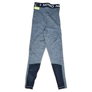 Elevate your workout with these Nike Pro leggings in size 2XS. The high-rise, 7/8 crop leggings offer compression in the leg area for ultimate support during running and jogging. The gray color and Nike Pro product line give a stylish touch to your activewear collection.