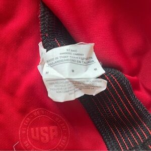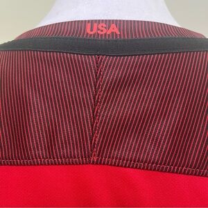 Bold red jersey with black sleeves. Features USA emblem and Nike logo. Ideal for soccer fans.