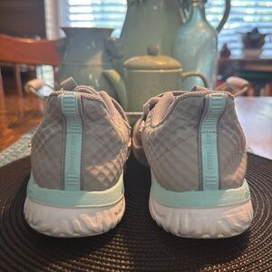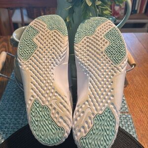 Light, stable and feature a deep, comfortable footbed for superior cushioning. A strap wraps your mid foot to lock you in during your most intense training work outs. Beautiful gray and mint color combination. From non-smoking home. (S-1)