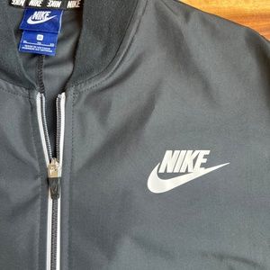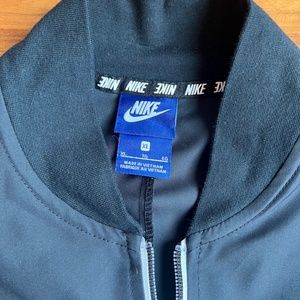 Retro Nike Black Full Zip Windbreaker Bomber Style Jacket with white Nike logo on the left front Nike spell-out down each arm.
