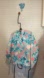 Has a teal background with yellow orange peach, colored flowers and patterns.
