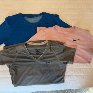 Three womens size medium Nike shirts- one blue Nike t-shirt, one pink Nike T shirt and one grey Nike Pro T-shirt. All used condition. From a smoke free home.