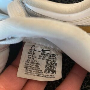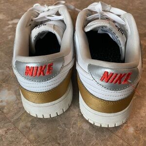 Stylish Nike women's shoes. Features gold and silver accents. Comfortable and trendy design.