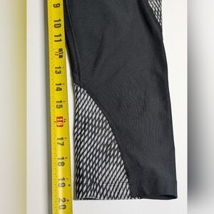 The product is a pair of Nike Women's Size S Dri-Fit Power Legendary Capris Tights Pants in Black. These activewear leggings feature a pull-on closure, mid-rise fit, and a 20-inch inseam. Made from recycled polyester and spandex, the tights are designed for activities like running, cycling, cross-training, dance, and CrossFit. They are fitted and feature moisture-wicking technology to keep you dry and comfortable during your workouts. The geometric pattern and athleisure theme make these leggings a stylish and functional addition to your active wardrobe.