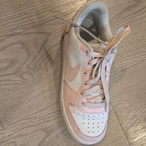 Stylish Nike sneakers for women. Features pink and white design. Comfortable and trendy.