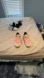 Stylish Nike sneakers with a peach mesh upper. Neon green accents on the tongue and sole. Comfortable and trendy design.